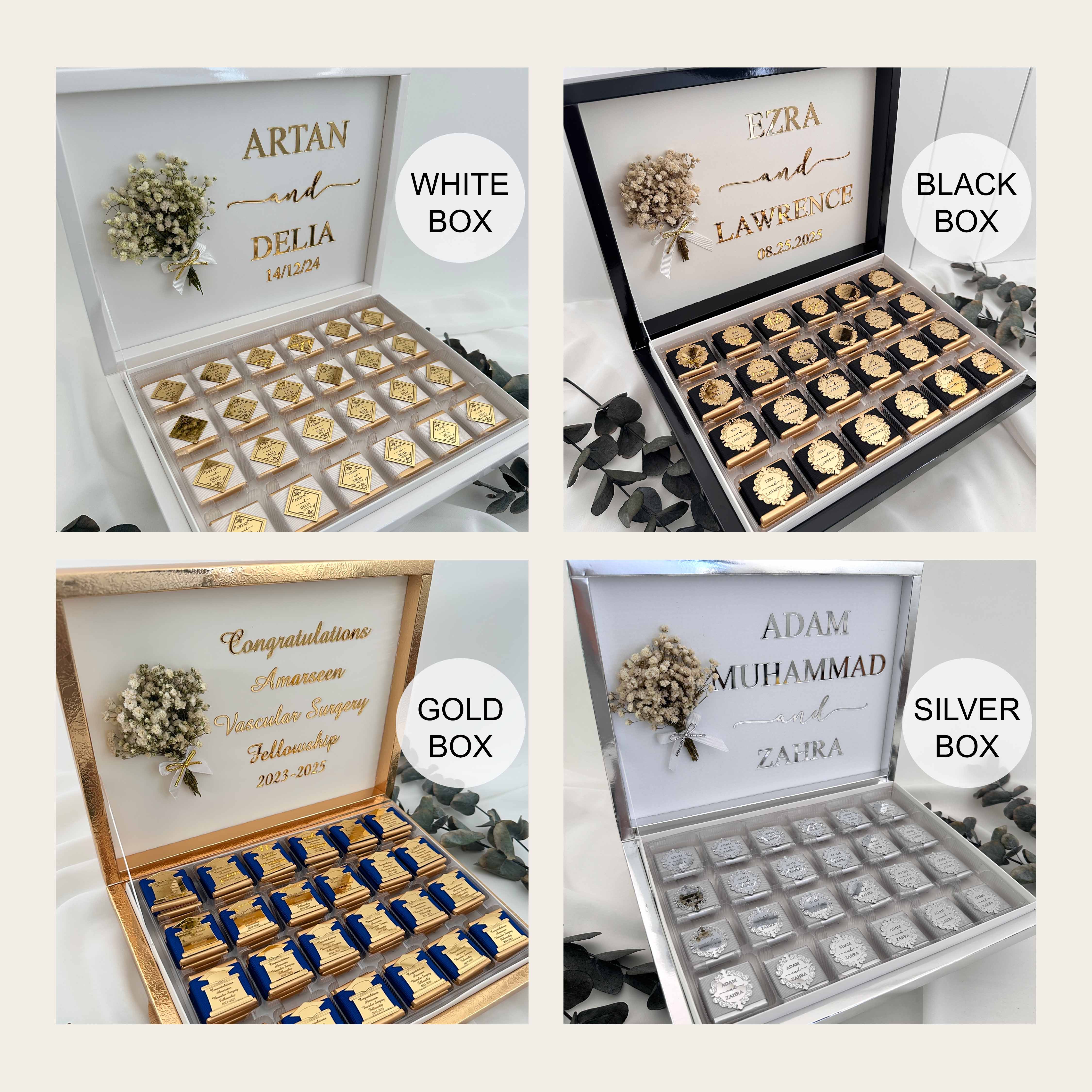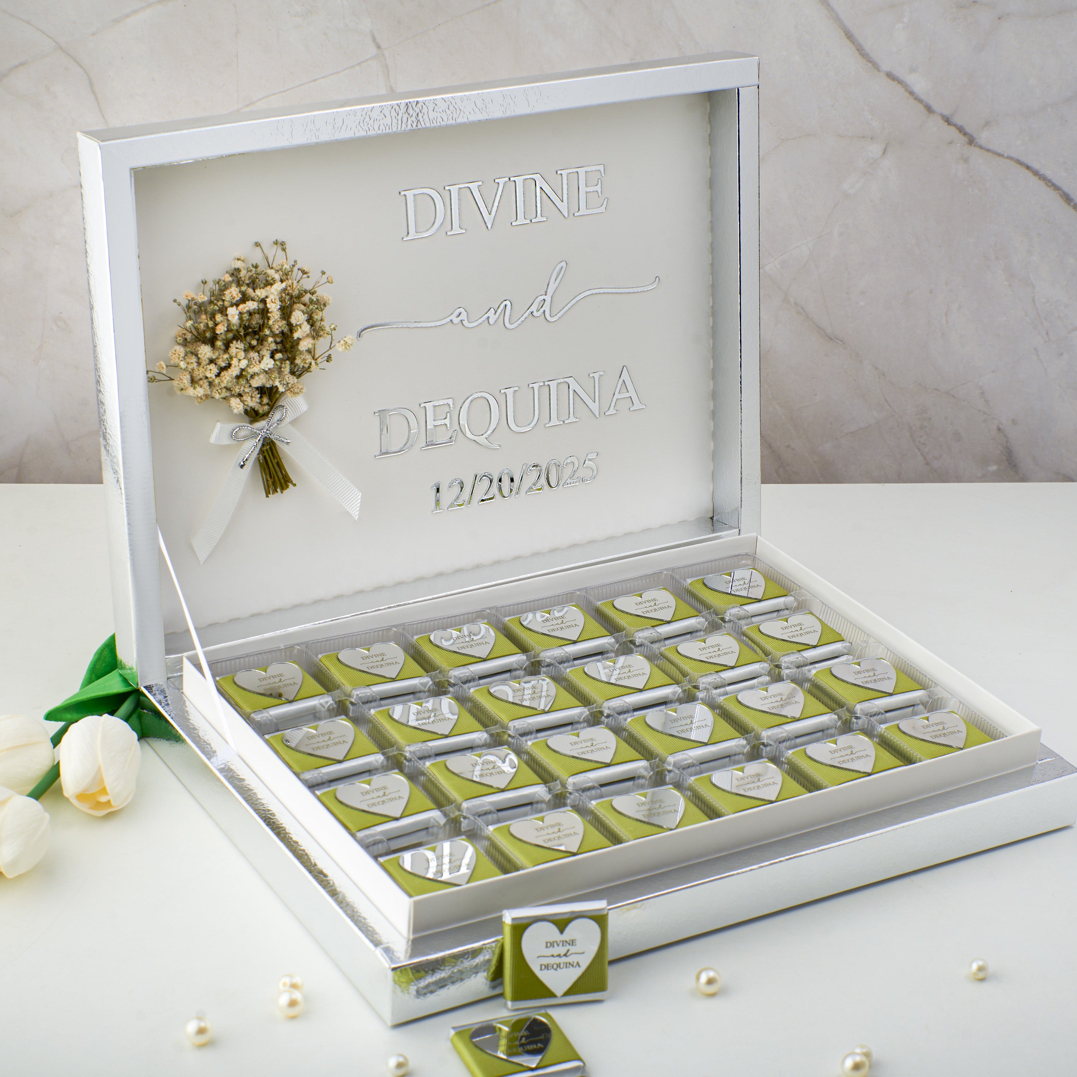 Customize every element from the color of the foil to the number of chocolates—perfect for weddings, baby reveals, and more.
