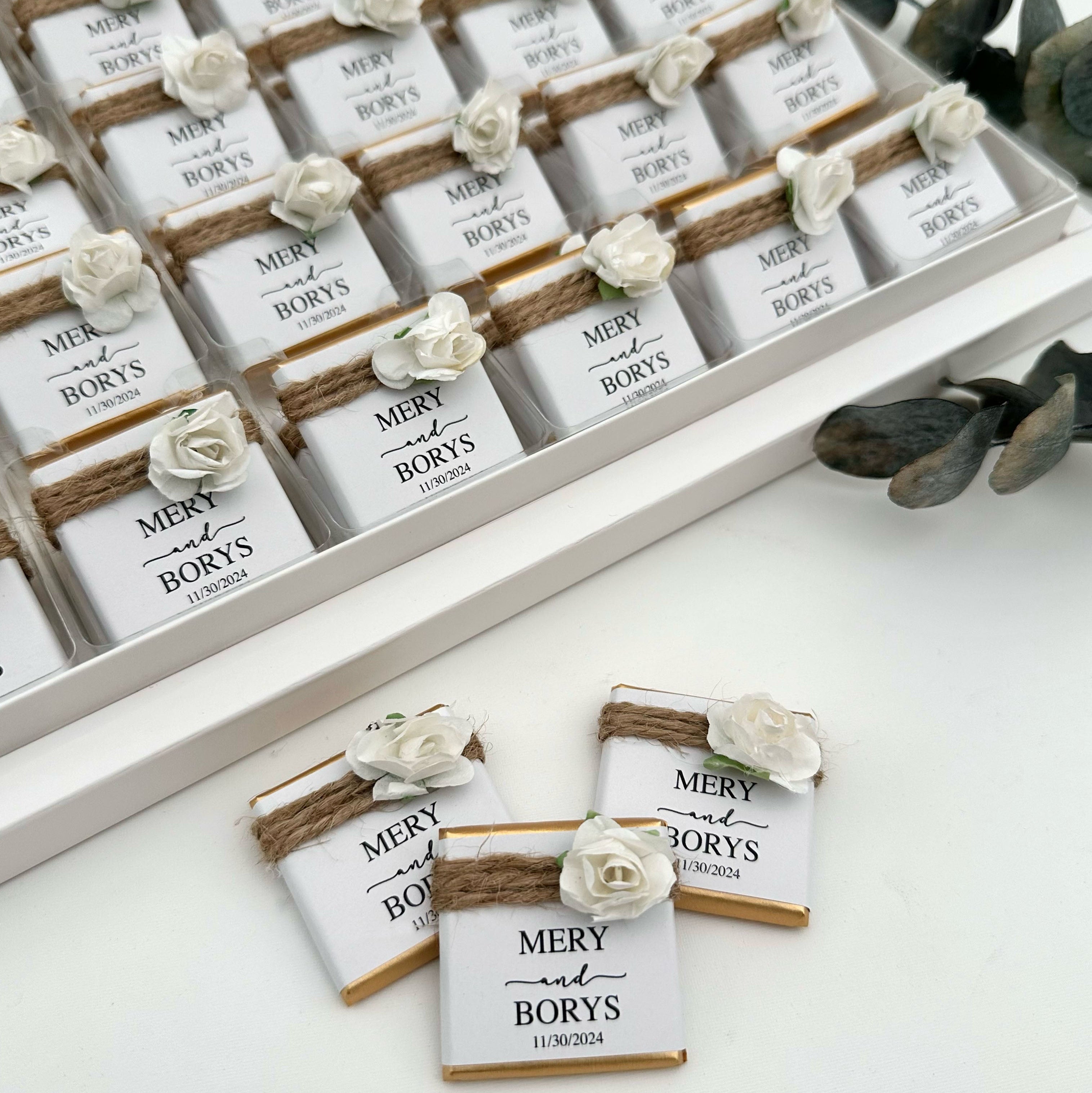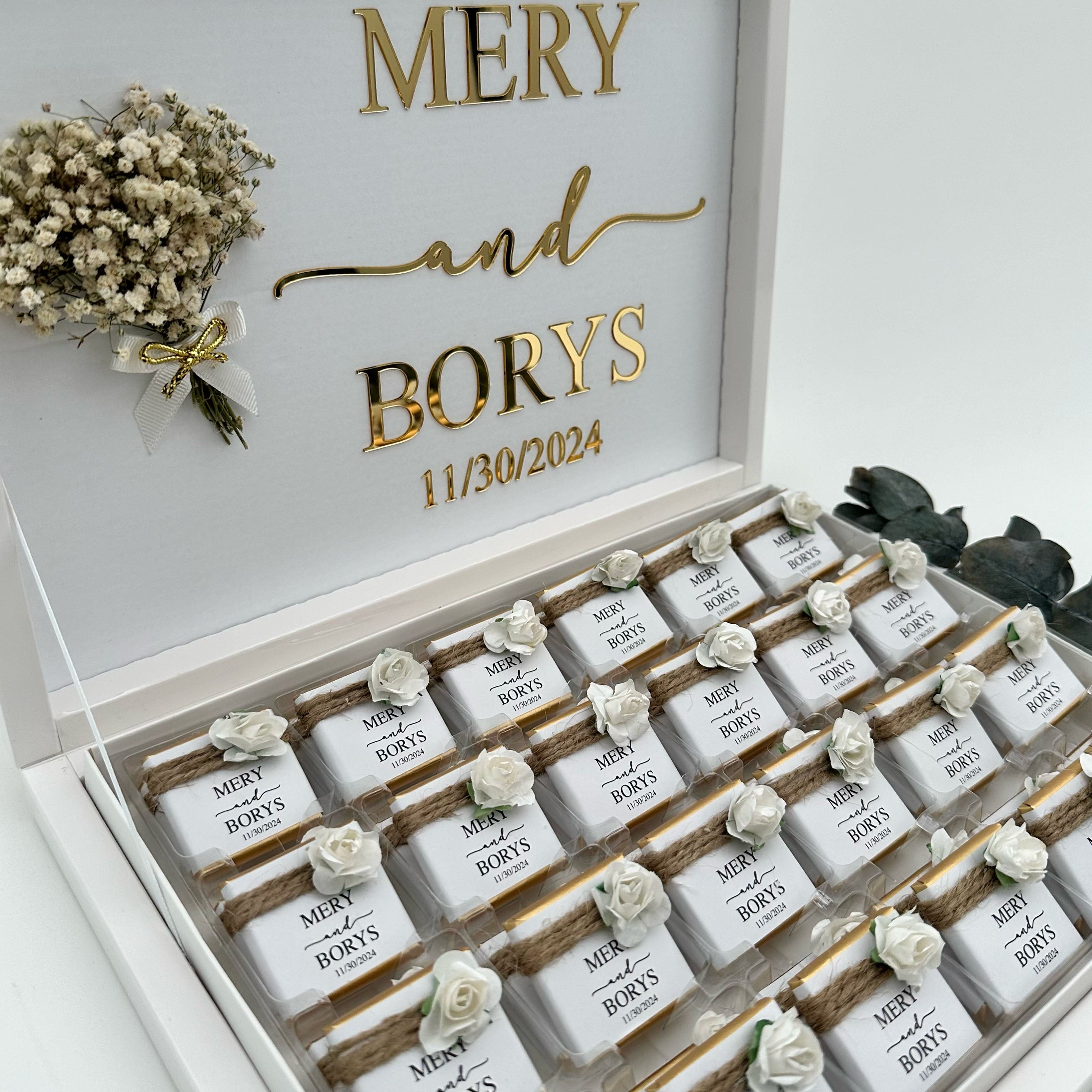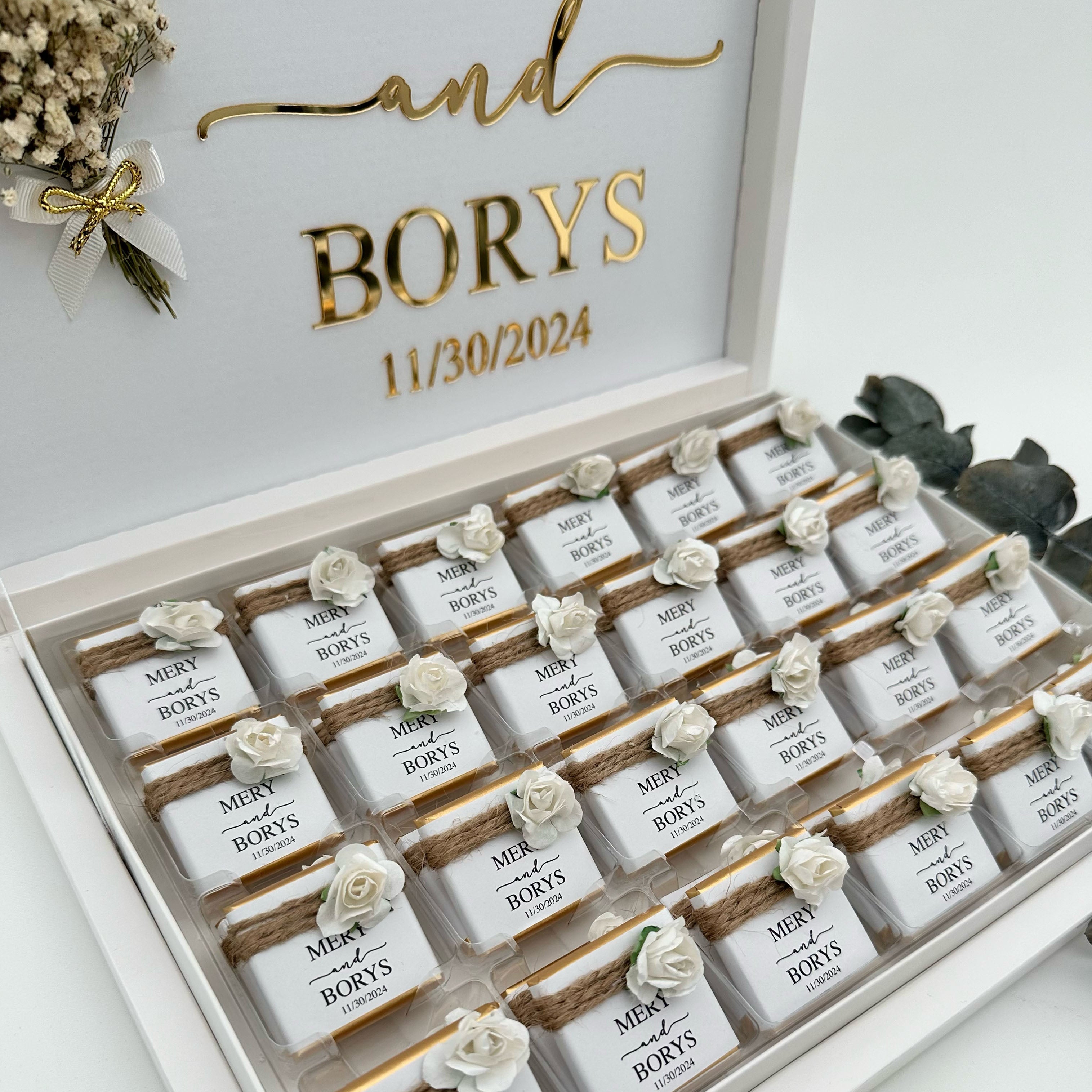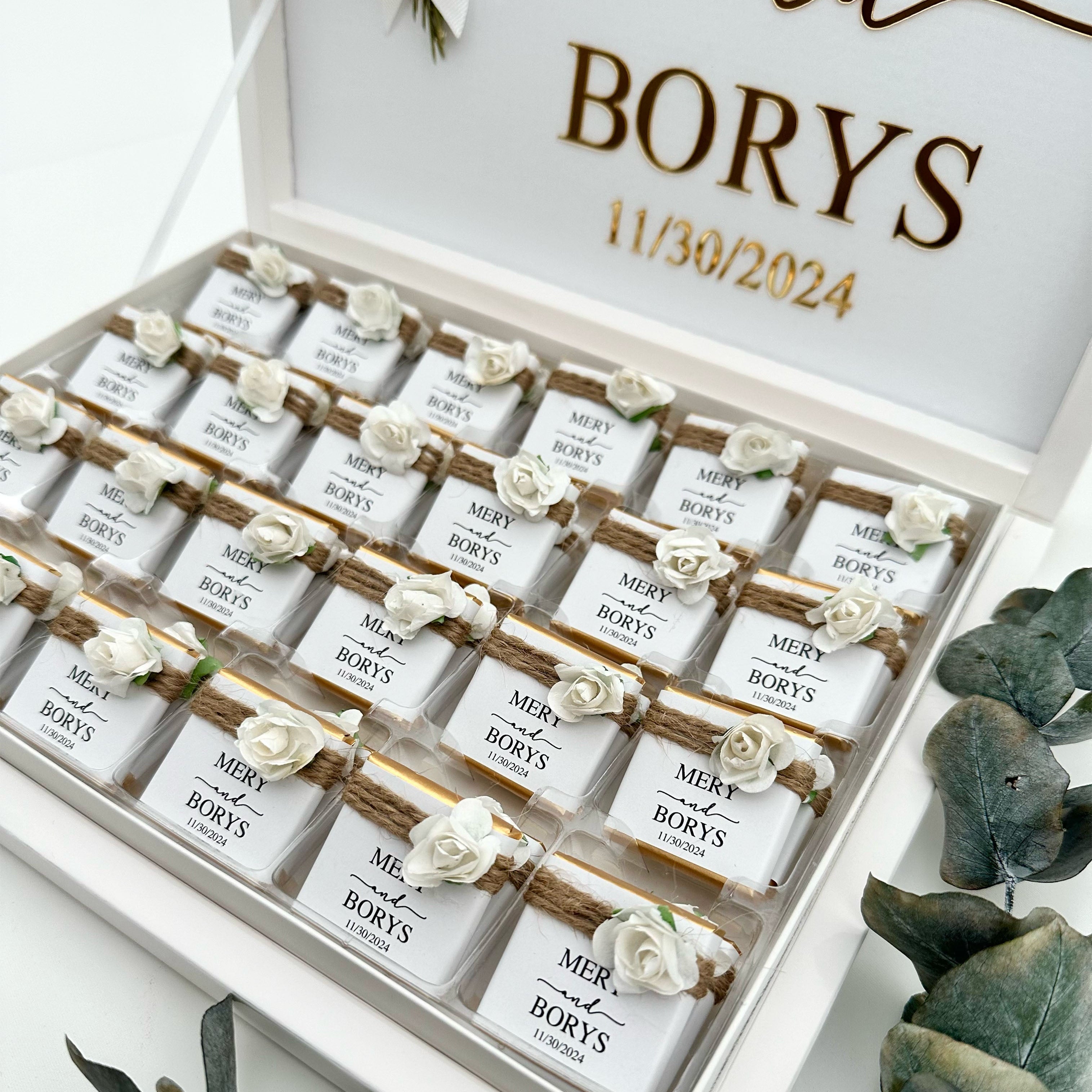 Customize every element from the color of the foil to the number of chocolates—perfect for weddings, baby reveals, and more.