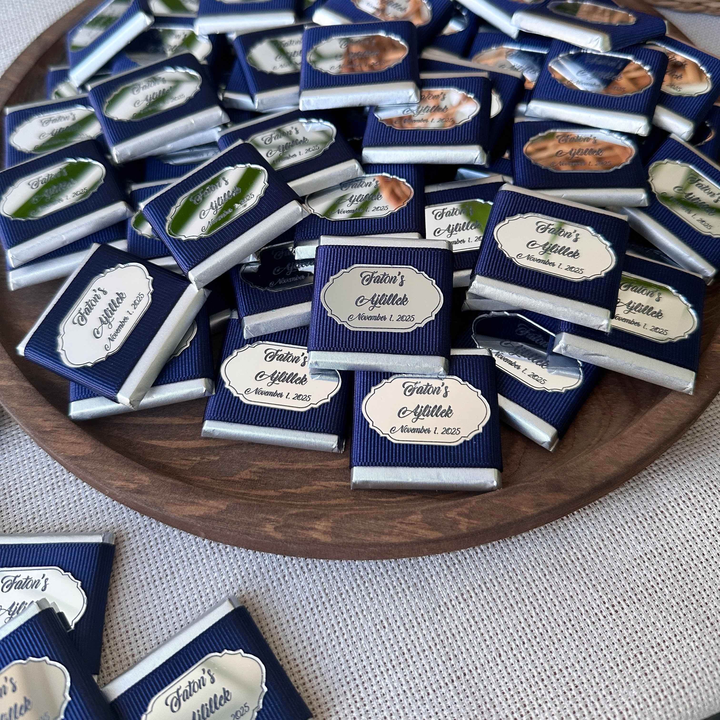 For an extra personal touch, every chocolate wrapper is customized with a sleek plexi tag, elegantly printed with the names of the honored couple and the date of their significant occasion, making these treats a sweet memento as well as a delightful indulgence.