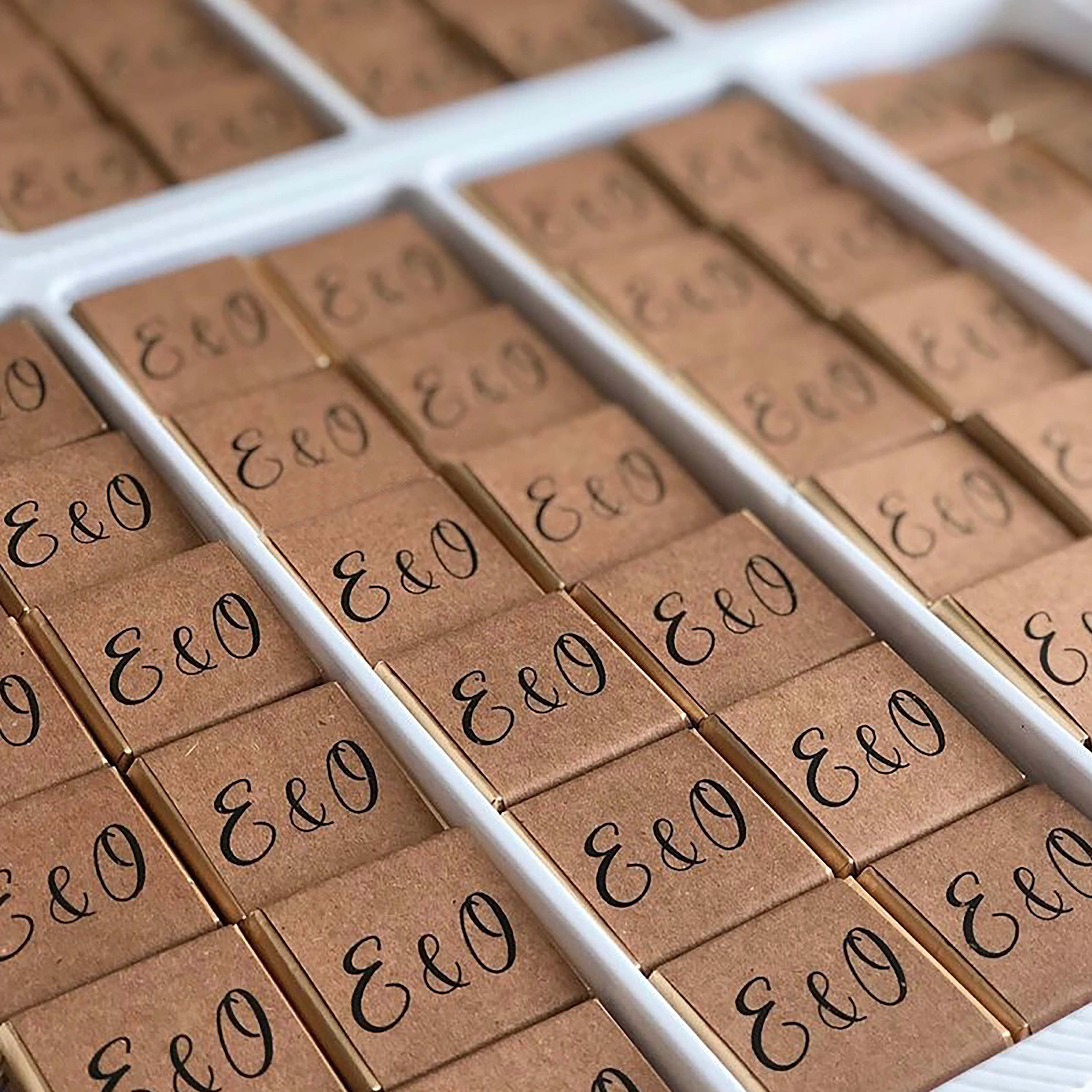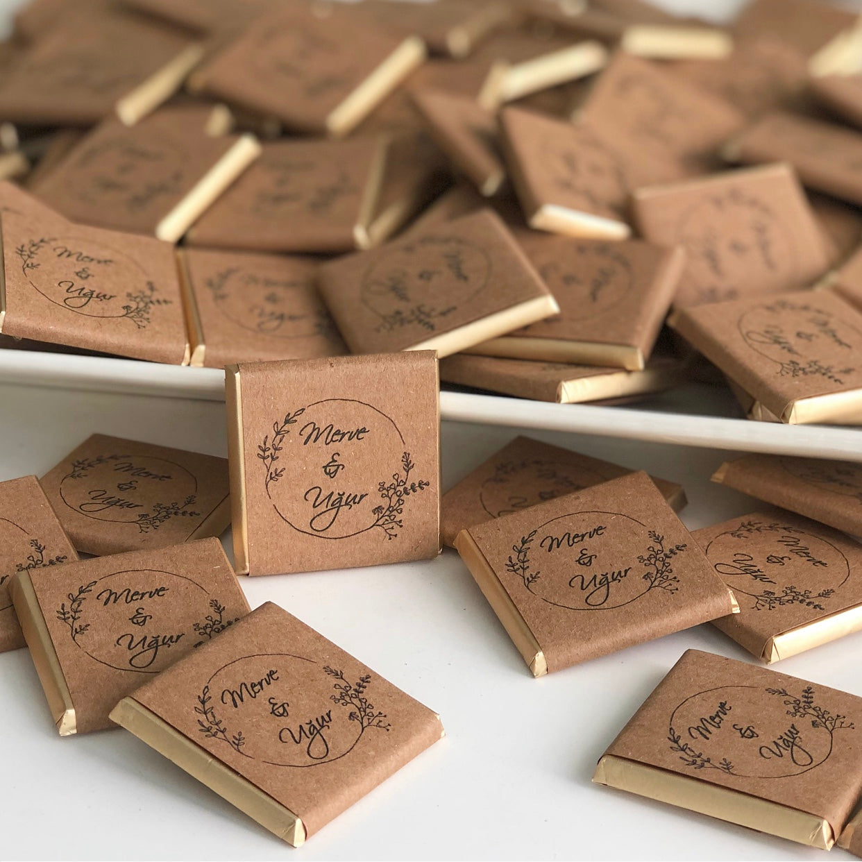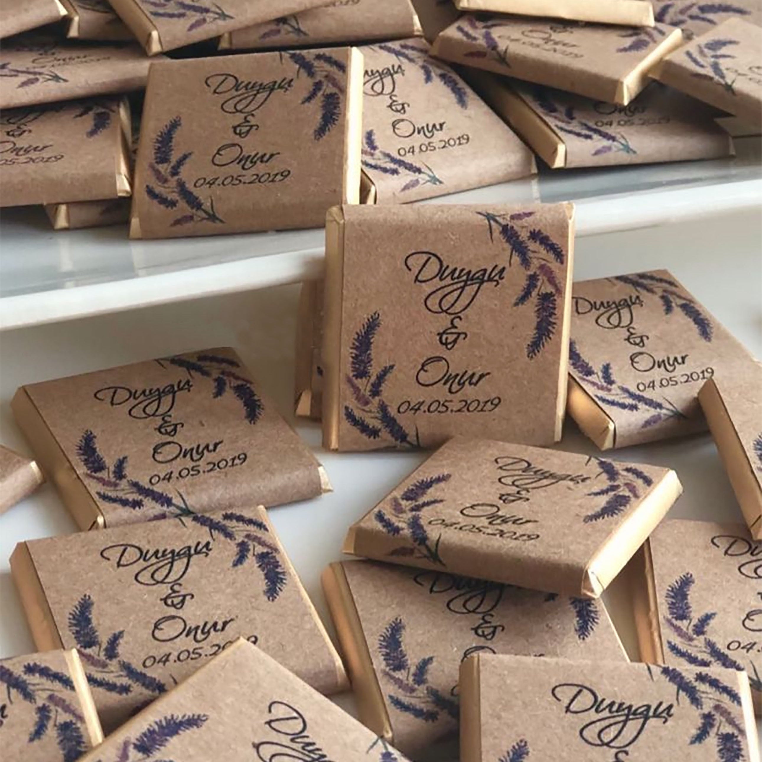 Each chocolate is carefully wrapped in eco-friendly kraft paper and personalized with names and date, making it a meaningful keepsake for your guests.