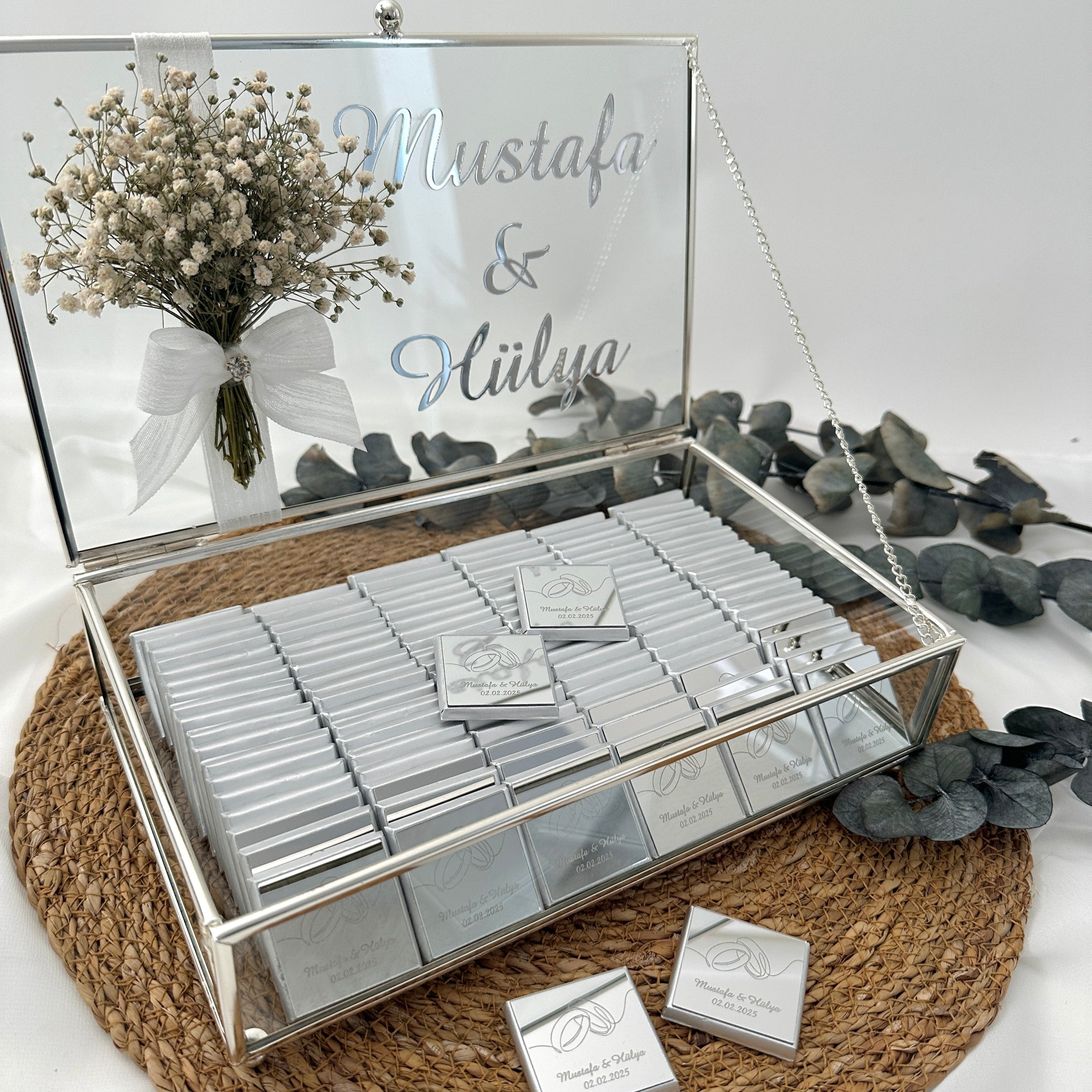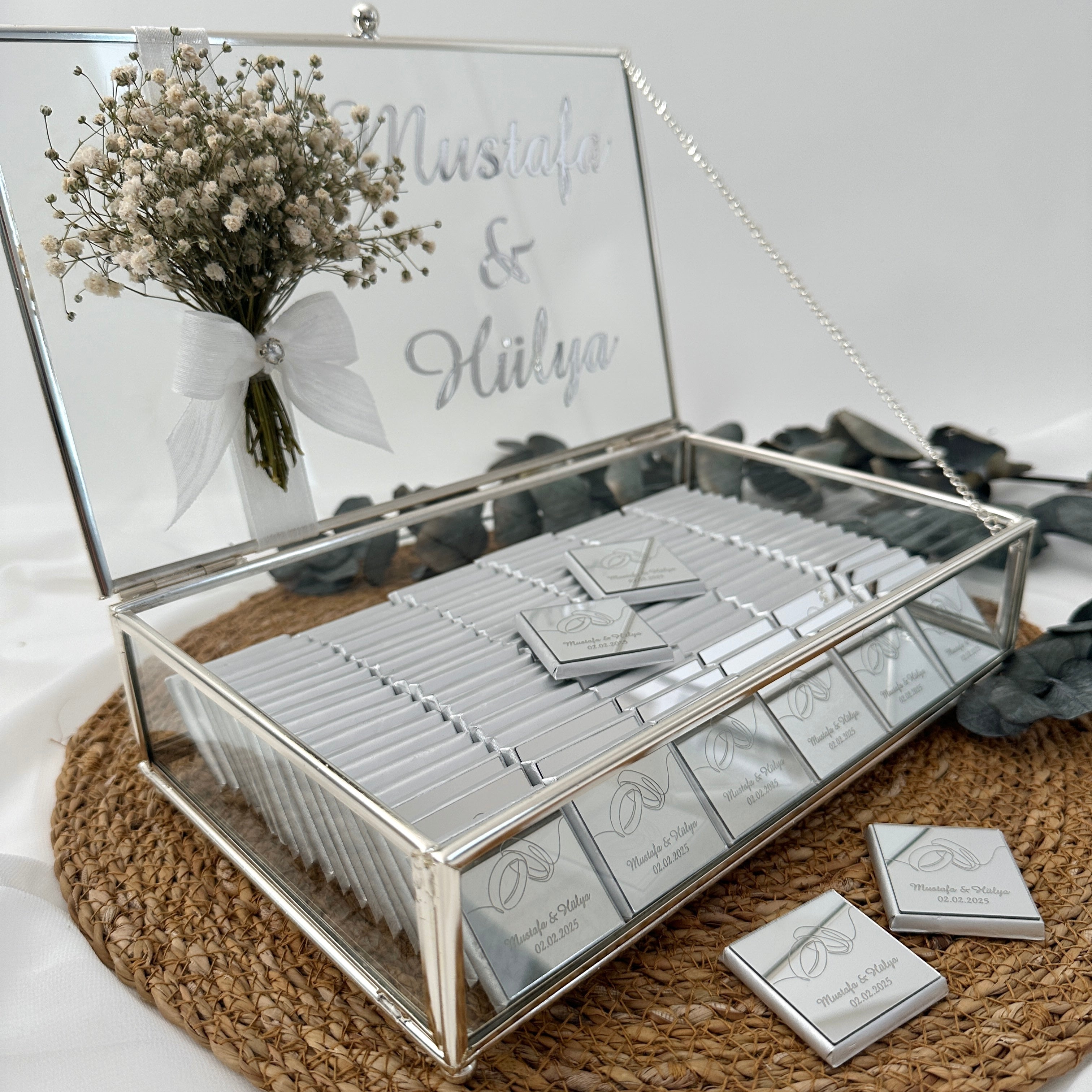 Add a touch of timeless elegance to your special day with this luxury glass box filled with personalized chocolates. ✨