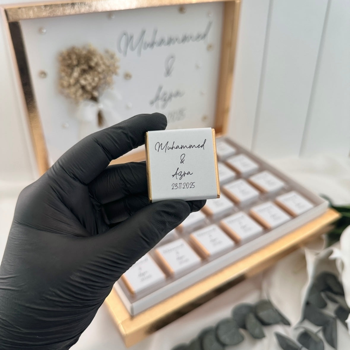 Each box is customized with the couple’s names and date, offering your guests a memorable keepsake. Inside, you’ll find individually wrapped premium chocolates presented in a stunning box.